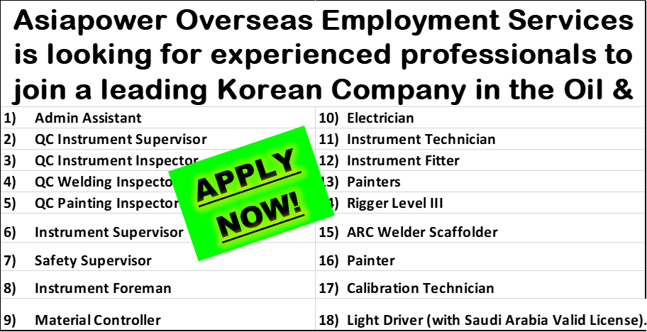 Asiapower Overseas Employment Services is looking for experienced professionals to join a leading Korean Company in the Oil & Gas industry for Construction (VR-441). Shortlisting is currently in progress and holding walk-in shortlisting interviews between 10am to 6pm (Mon-Sat).