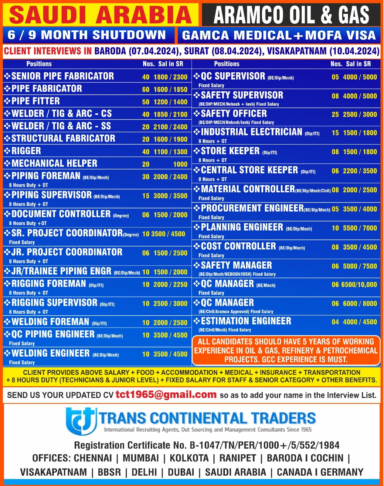 Trans Continental Traders is an international recruiting agency, outsourcing, and management consultancy firm. With over 50 years of experience, we have been providing our services in various locations including Chennai, Mumbai, Kolkata, Ranipet, Baroda, Cochin, Visakhapatnam, BBSR, Delhi, Dubai, Saudi Arabia, Canada, and Germany.